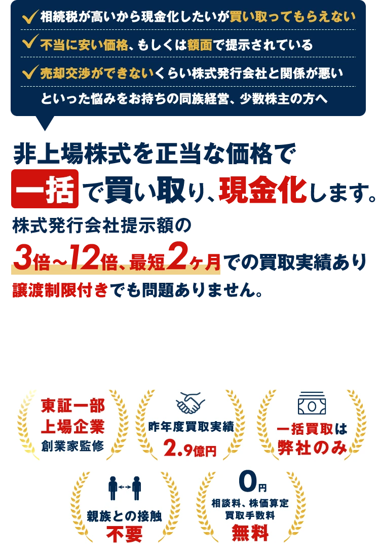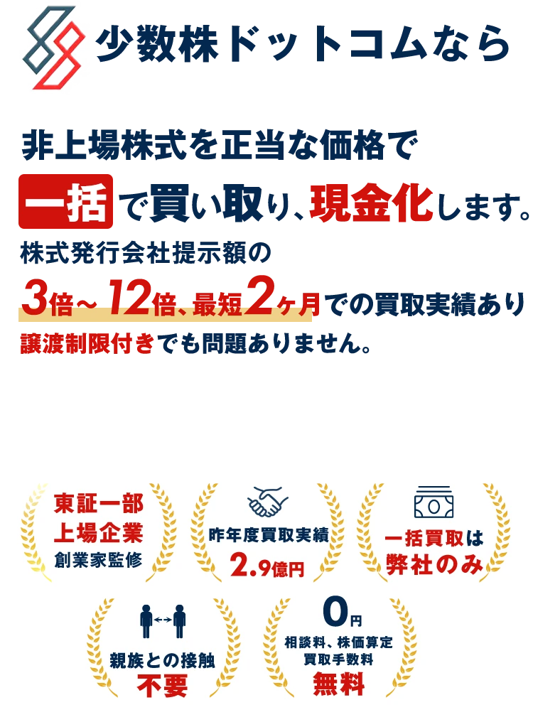 そんな少数株主のために、弊社で正当な価格で買取、弊社から株式発行会社へ売却する本サービスを立ち上げました。